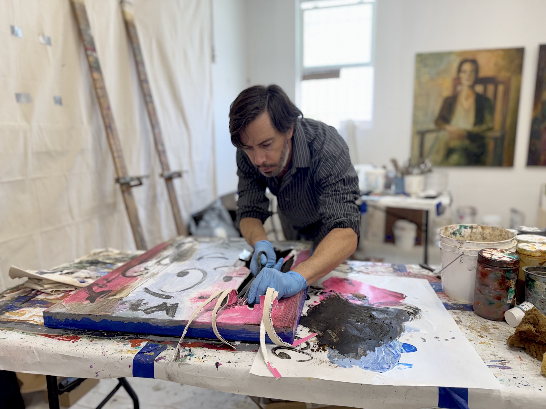 My early work centered on painting, often moving between abstraction and representation. The human figure became a way to hold psychological states within a shifting environment. Over time I became interested in incorporating other materials into the painting process.